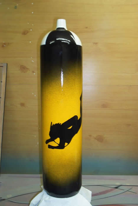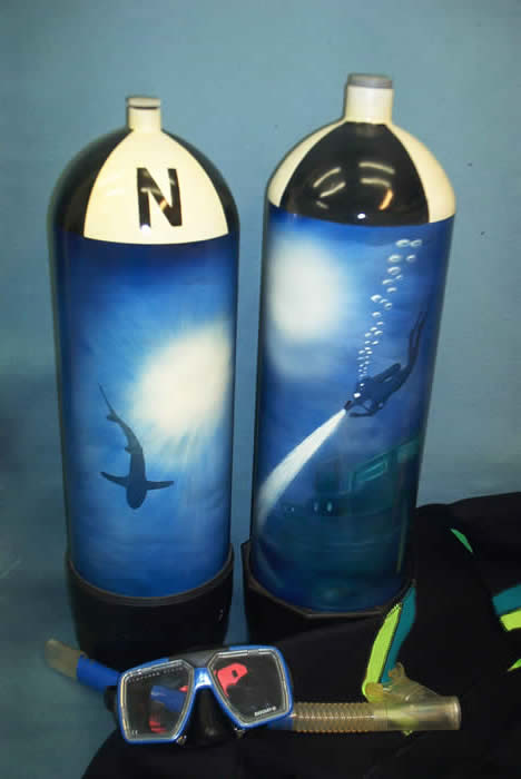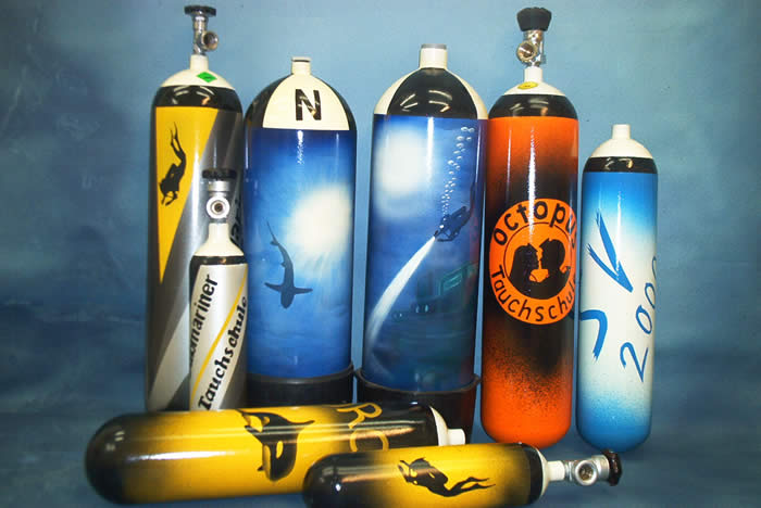 Wir sind Europaweit die ersten die ihre Taucherflaschen nach ihren Vorgaben bearbeiten und verschönern. Die Flaschen bleiben völlig funktionstüchtig und die schwarz/weiß Signatur wird erneuert. Durch ein spezielles Lackierverfahren kann auch Salzwasser ihr Motiv nicht beschädigen. Für mehr Informationen schreiben sie uns eine email oder rufen sie uns an.